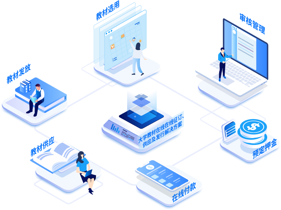 学校教材建设及流程管理;教材采购供应及预警管理;教材发行及双向溯源管理;全省教材征订及使用管理;